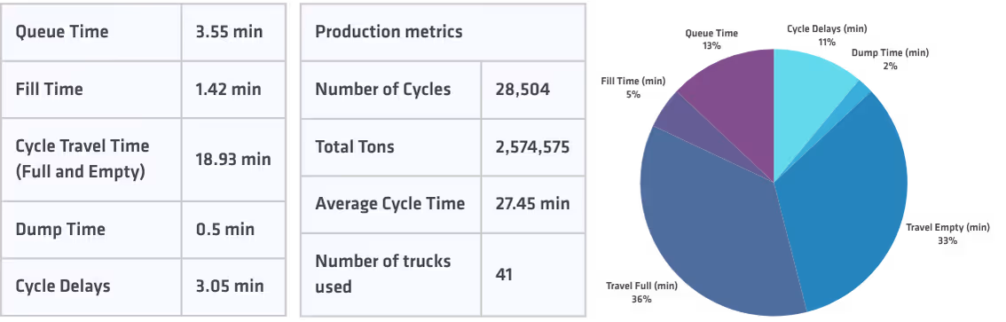 Notre client, une exploitation minière à grande échelle, cherchait à améliorer sa productivité tout en respectant ses objectifs environnementaux.Malgré l'utilisation d'une flotte de 41 camions et la réalisation de 28 504 cycles pour déplacer plus de 2,5 millions de tonnes de matériaux, l'exploitation était confrontée à des inefficacités dues aux files d'attente et aux retards des cycles.