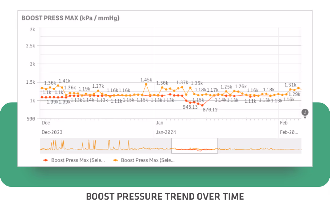 Un« rapport de surveillance de l'état » de routine généré parSmartFleetDX Insights a alerté les techniciens d'une anomalie dans les mesures de pression de suralimentation (boost) et de température d'échappement sur une excavatrice PC2000. ANALYSE DE LA PRESSION DE SURALIMENTATION ET DE LA TEMPÉRATURE D'ÉCHAPPEMENT D'